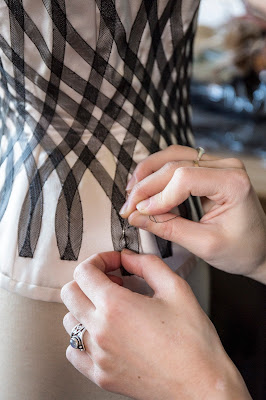 J'ai trouvé un ruban de crin synthétique similaire à celui de la veste, et l'idée était de créer en l'entrelaçant un motif qui "embrasse" la taille et la réduise visuellement, tout en créant des jeux de transparence. Une fois le motif trouvé, j'ai maintenu les rubans avec des épingles, puis je les ai bâtis soigneusement avant de tout coudre minutieusement à points coulés.